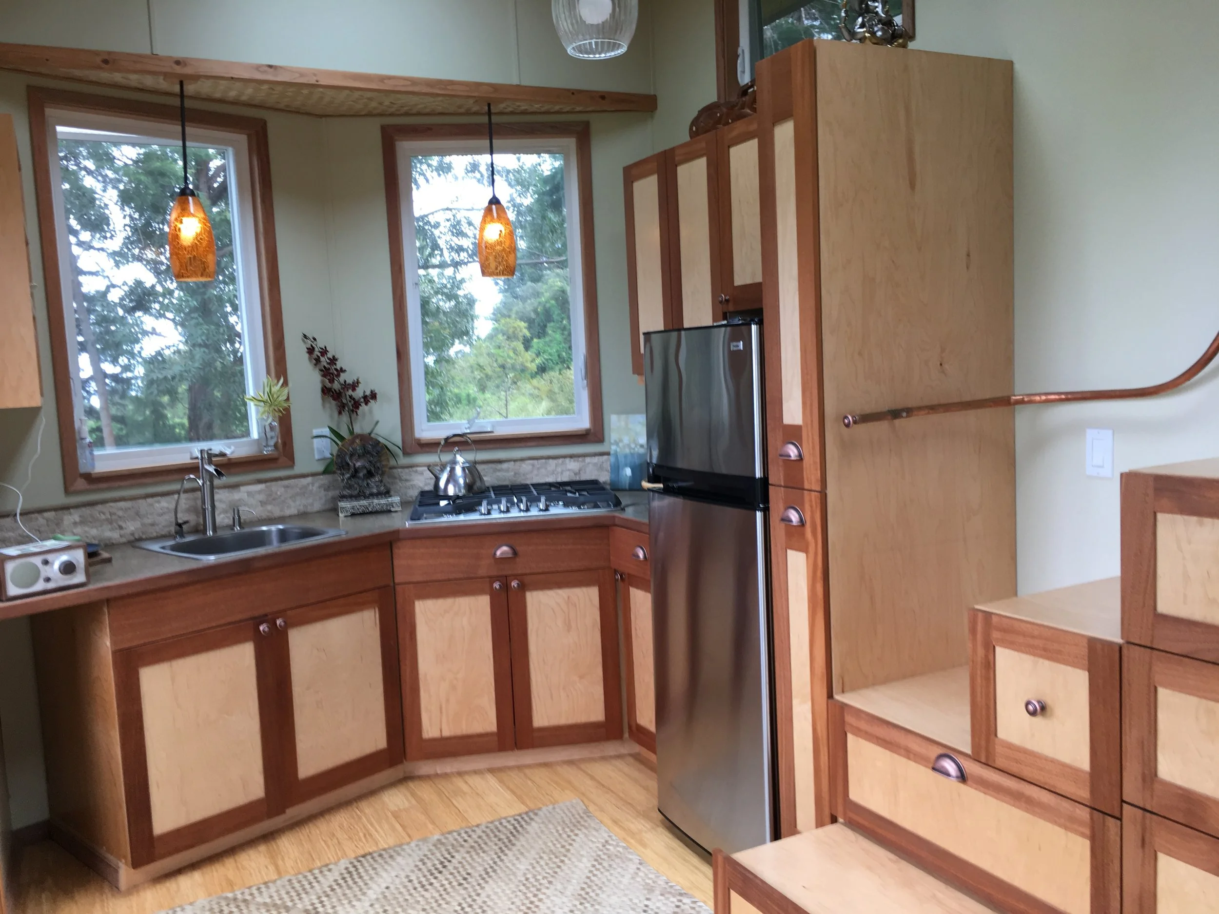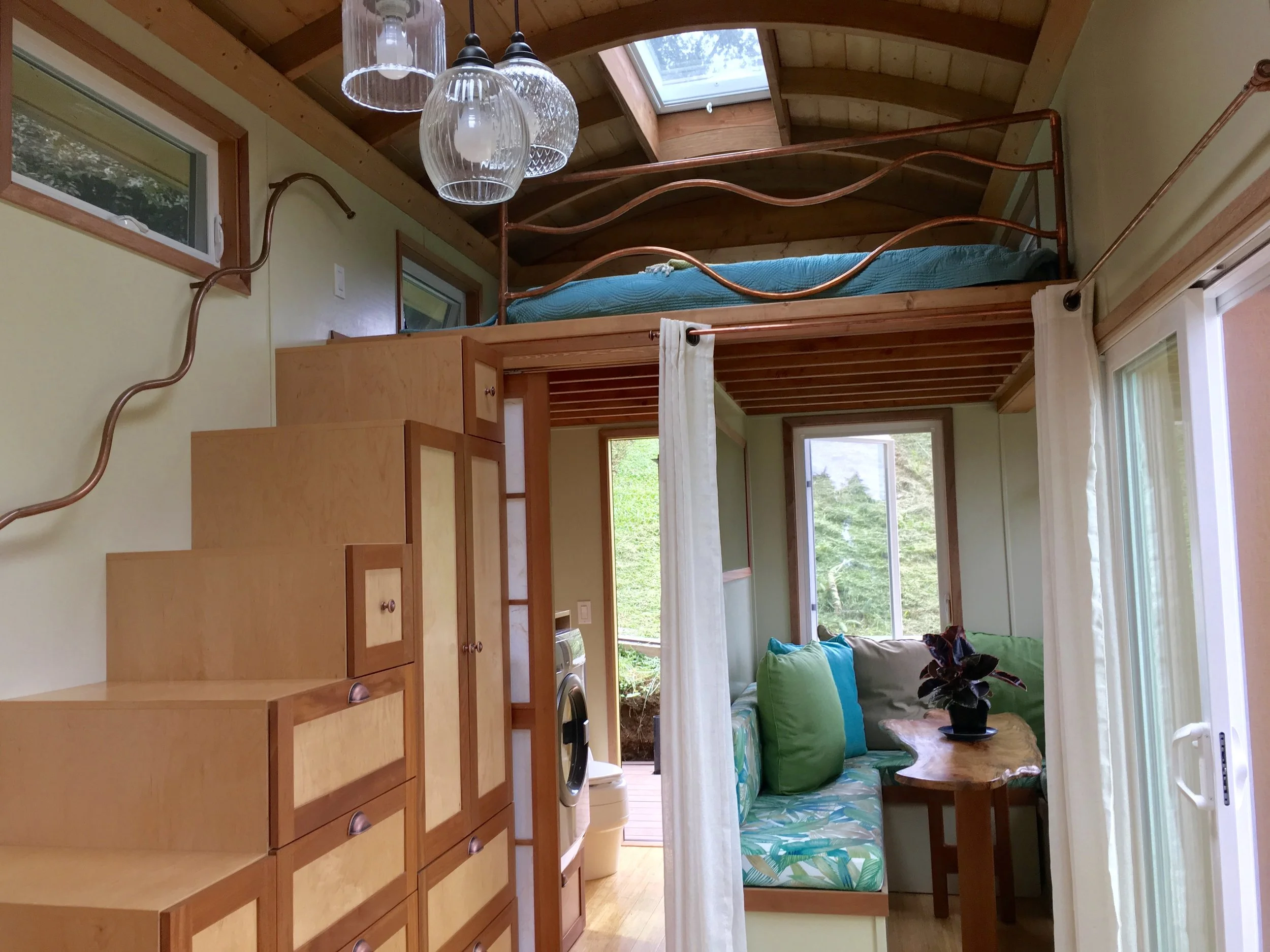 An outdoor covered lanai wraps around three sides. Two doors and a sliding front entrance lead you to the light-filled interior, where lovely sheer curtains allow the dining nook to transform into a cozy sleeping area. A barrel roof and large openable skylight make for a spacious loft bedroom area, where a queen size bed is surrounded by windows on all sides. A custom beautiful mango slab table can be easily moved into the spacious kitchen area—to become a kitchen island—or out to the covered lanai through the large sliding glass doors for dining.